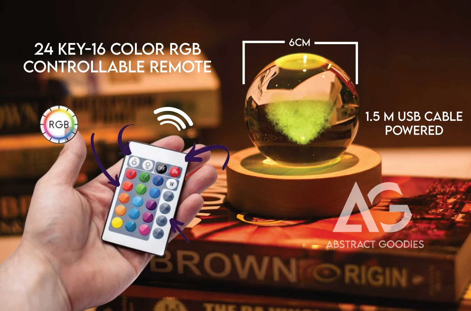 The crystal ball sits on a solid wooden base with an 8cm diameter, ensuring stability and a natural, minimal look. With the included 16-color RGB remote control, you can easily change colors, adjust brightness, and enjoy the 4 color cyclic lighting modes to match your mood or environment.