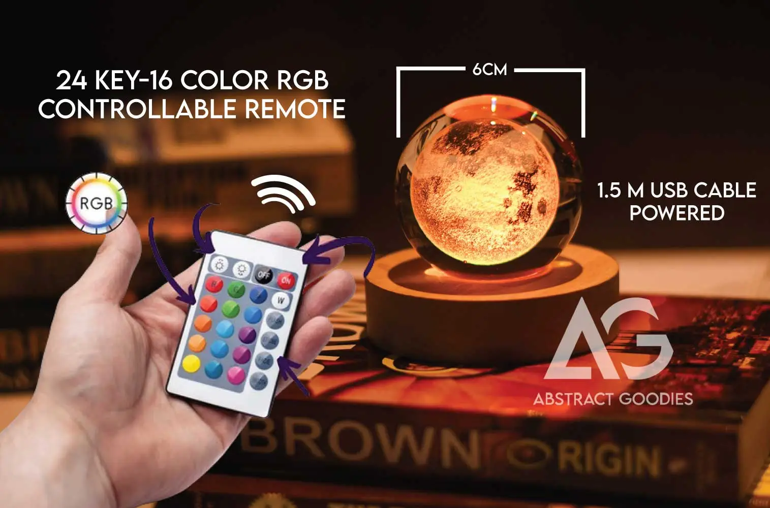 The crystal ball sits on a solid wooden base with an 8cm diameter, ensuring stability and a natural, minimal look. With the included 16-color RGB remote control, you can easily change colors, adjust brightness, and enjoy the 4 color cyclic lighting modes to match your mood or environment.